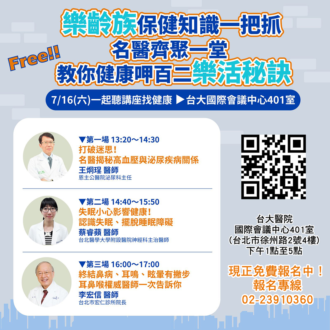 名醫開講-免費健康公益講座,由臺北醫學大學校友會教育基金會、綠杏文化事業基金會、中華民國防高血壓協會共同支持主辦,每期邀請不同科別之專業醫師出席,傳達正確的保健新知,開放民眾免費報名參加,歡迎揪團預約報名喔!